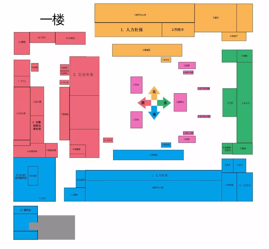 1层:人力社保综合受理区(包含社保、医保、就业、人才和市民卡等窗口)、公安业务服务区(包含公安出入境、交警违章,城管违停处理等窗口)、24小时自助服务区、配套服务银行。