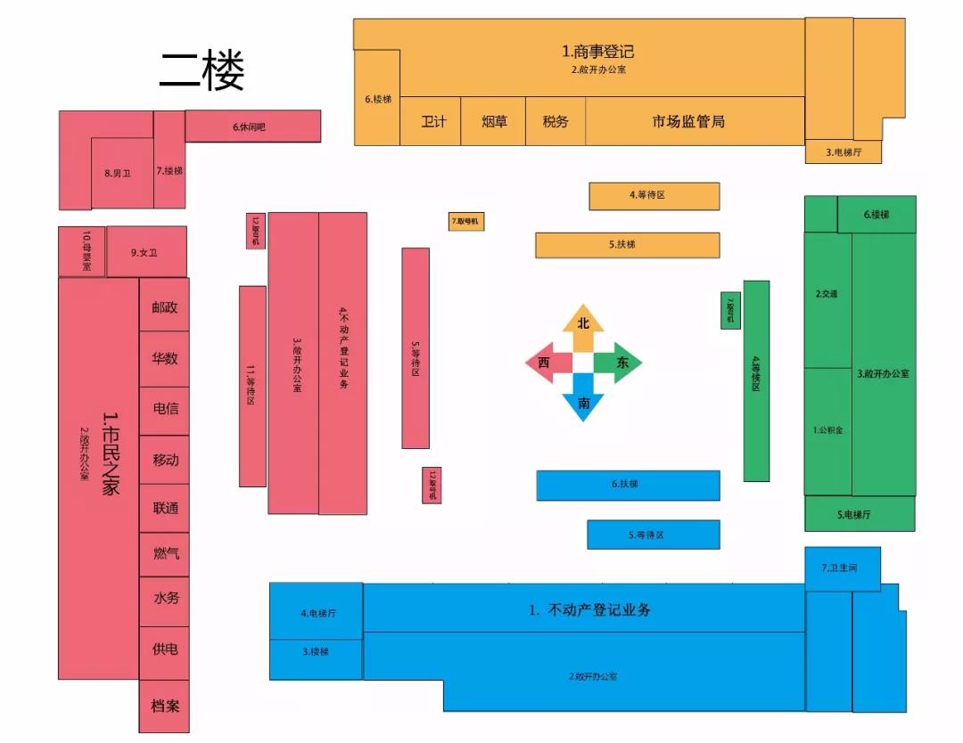 2层:不动产登记综合受理区、商事登记综合受理区、公积金业务服务区、交通业务服务区等窗口,此外还将有市民之家服务区,可以缴纳水电气、华数电视、移动、联通、电信等费用。
