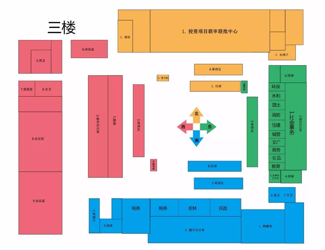 3层:投资项目联审联批中心(包含发改、规划、住建、经信、国土、环保、水利、消防等多个部门窗口)和社会事务综合受理区(包含城管、教育、文广新、民政、商务、农林等部门窗口),税务业务服务区。
