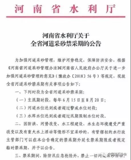 河南省水利厅发布《关于全省河道采砂禁采期的公告》,要求主汛期(6月15日至8月20日)禁止一切河道采砂活动。