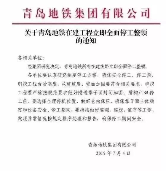 另据相关方面最新消息,青岛地铁当日已经下发通知立即全面停工整顿,涉所有在建线路,要求各单位研究制定停工方案,确保安全停工。