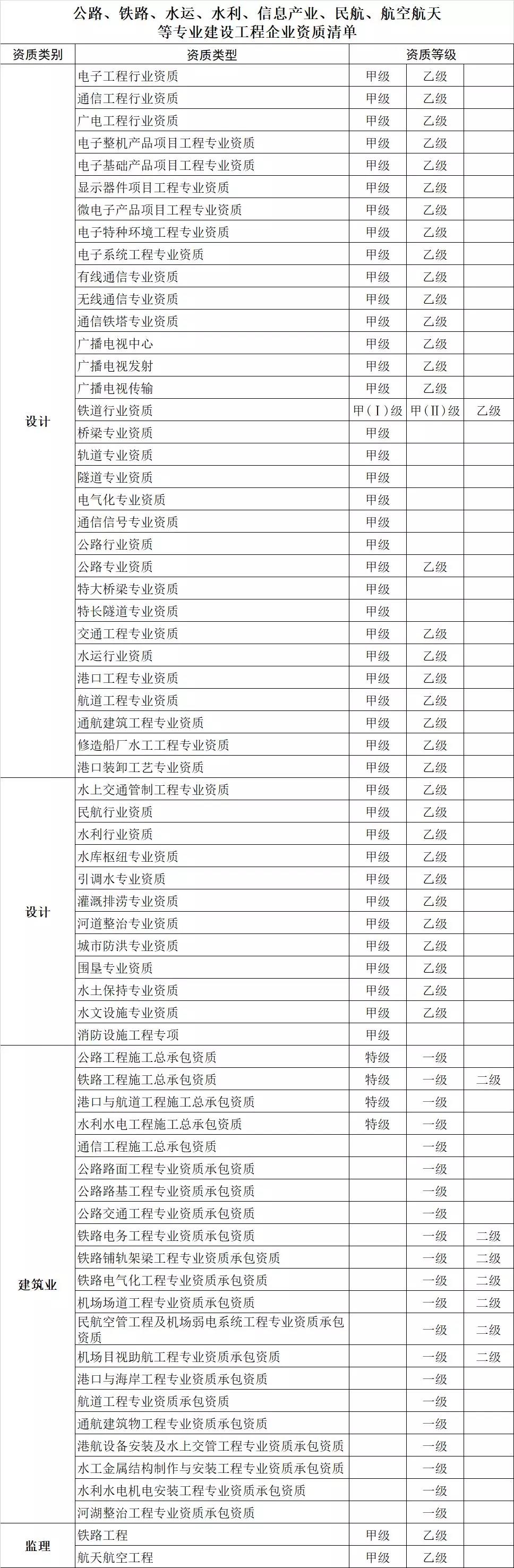 附件:公路、铁路、水运、水利、信息产业、民航、航空航天等专业建设工程企业资质清单