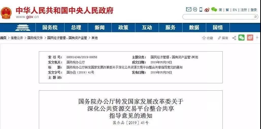 近日国务院办公厅发布《国务院办公厅转发国家发展改革委关于 深化公共资源交易平台整合共享指导意见的通知》(国办函〔2019〕41号),通知明确提出: