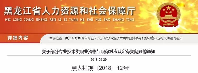 2018年12月,黑龙江省人社厅发布《关于部分专业技术类职业资格与职称对应认定有关问题的通知》。明确46项专业技术类职业资格与职称的对应关系。