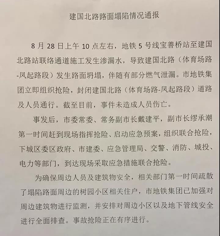 2019年8月28日中午11时许,杭州建国北路和体育场路交叉路口路面出现塌陷事故。初步查明,系地铁5号线联络通道施工发生渗漏水,导致该路段路面坍塌,伴随部分燃气泄漏。
