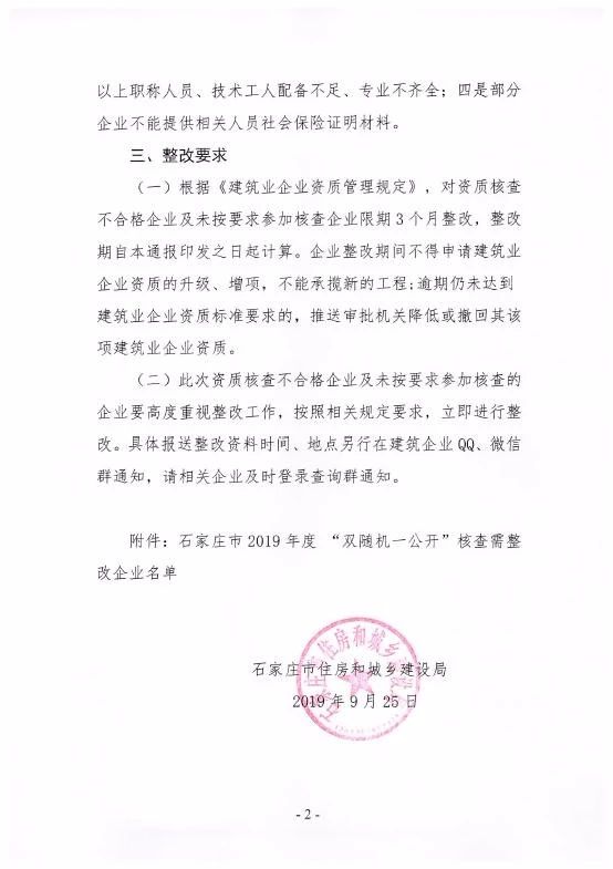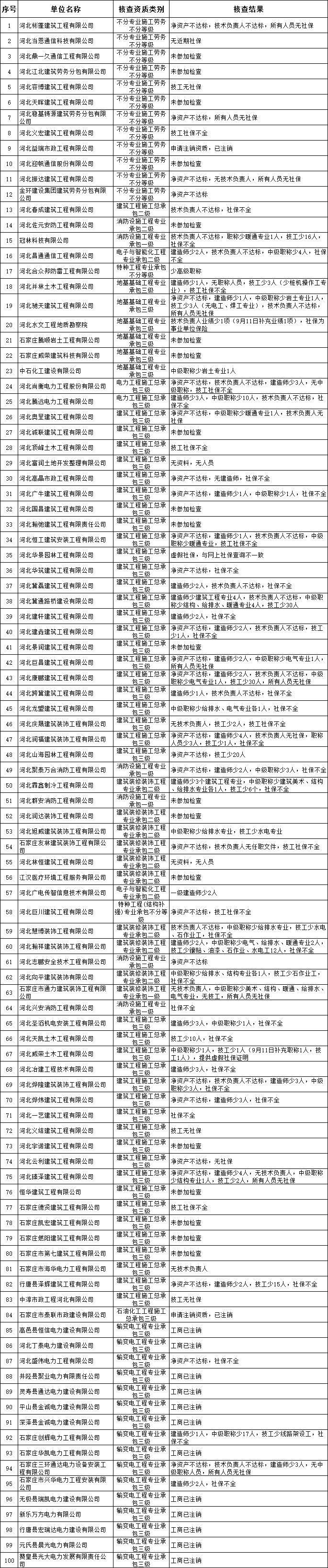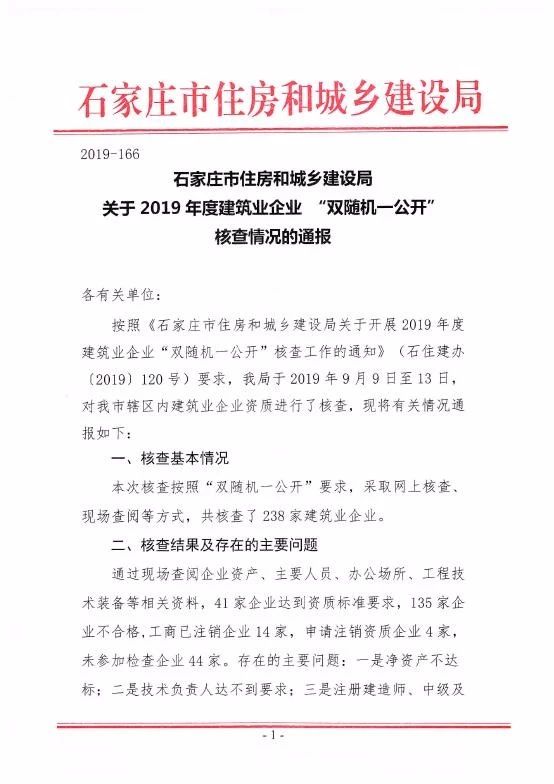 近日,河北石家庄市住建局通报2019年度建筑业企业 “双随机一公开” 核查情况: