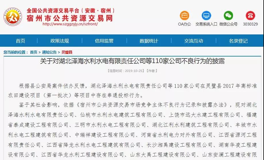 近日,安徽省宿州市公共资源交易网披露一起串通投标案。根据县公安局案件侦办反馈,110家公司在灵璧县2017年高标准农田建设项目(第一批次)等项目中存在串通投标行为。