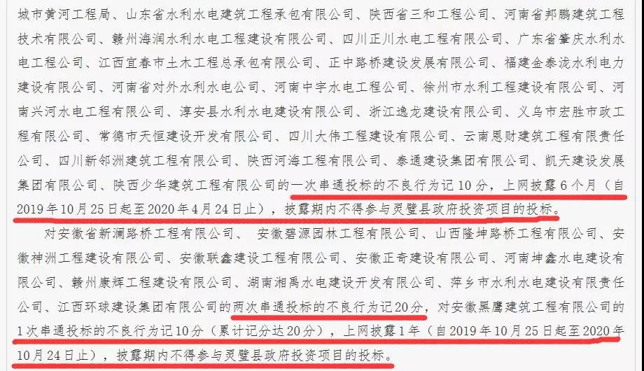 灵璧县公共资源管理局分别对相关企业予以扣10分、20分和30分的处罚,网上披露时长为6个月、1年、2年不等,在披露期间,这些企业将不得参与灵璧县政府投资的项目投标。