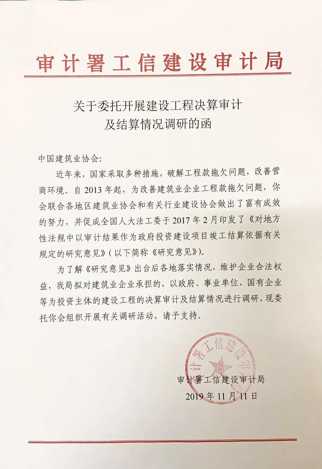 1、审计署工信建设审计局《关于委托开展建设工程决算审计及结算情况调研的函》