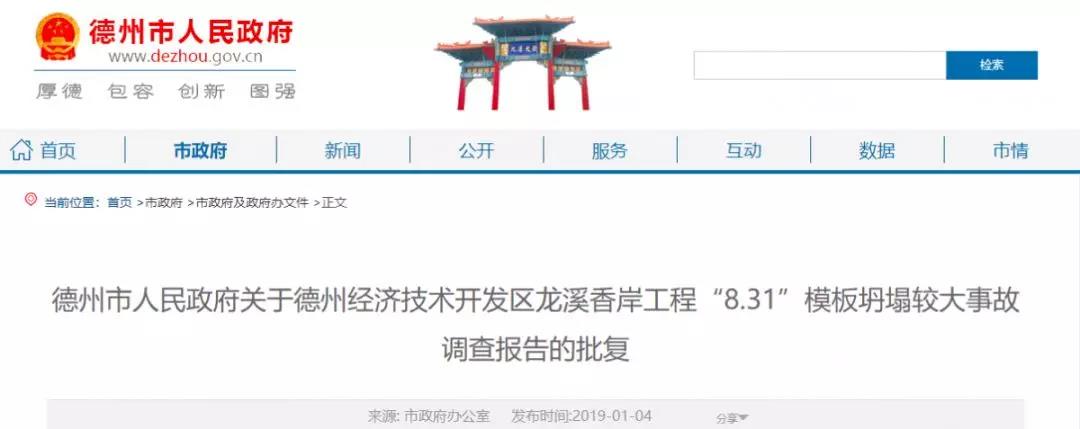 二、同意事故调查组对事故的原因分析和责任认定。德州经济技术开发区龙溪香岸工程“8.31”模板坍塌事故是一起较大生产安全责任事故。