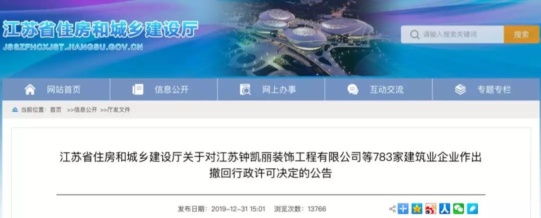 日前,江苏省住建厅发布《关于对江苏钟凯丽装饰工程有限公司等783家建筑业企业作出撤回行政许可决定的公告》。