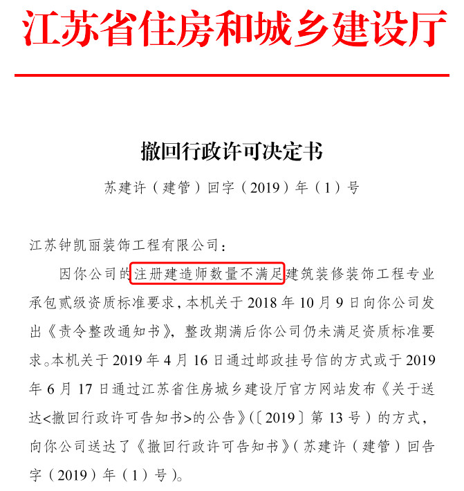 根据《建筑业企业资质管理规定》第二十八条第二款规定:“企业不再符合相应建筑业企业资质标准要求条件的,县级以上地方人民政府住房城乡建设主管部门、其他有关部门,应当责令其限期改正并向社会公告,整改期限最长不超过3个月;企业整改期间不得申请建筑业企业资质的升级、增项,不能承揽新的工程;逾期仍未达到建筑业企业资质标准要求条件的,资质许可机关可以撤回其建筑业企业资质证书”,本机关决定撤回江苏钟凯丽装饰工程有限公司等783家企业的有关建筑业资质(见附件),并依据《建筑业企业资质管理规定》第三十条规定依法予以注销。