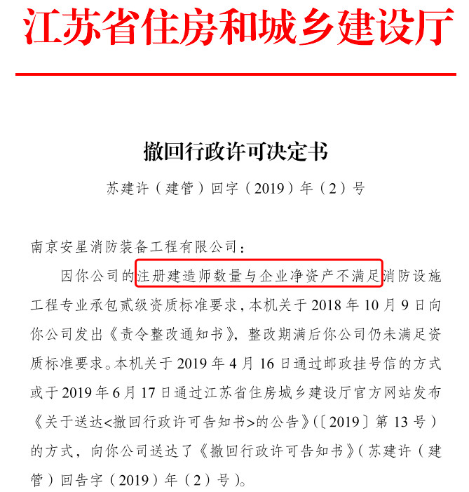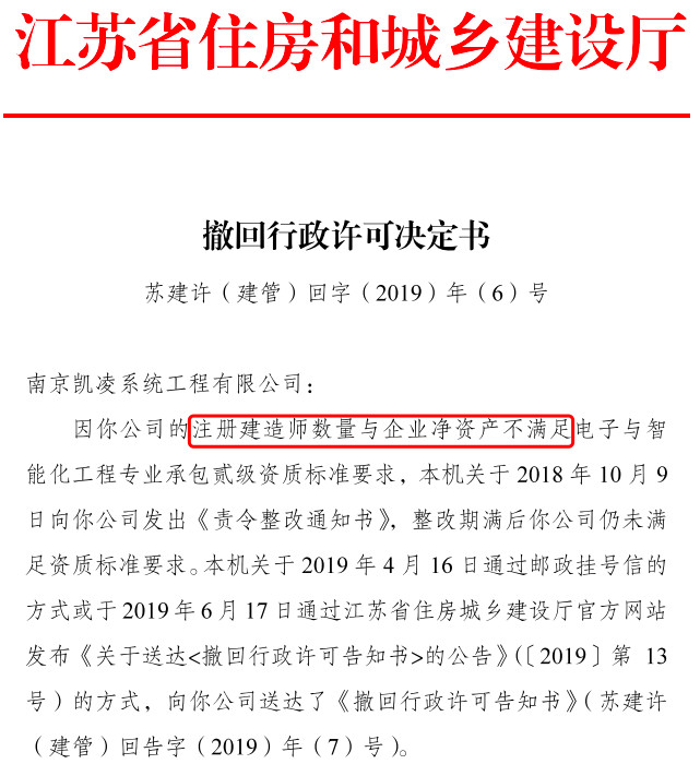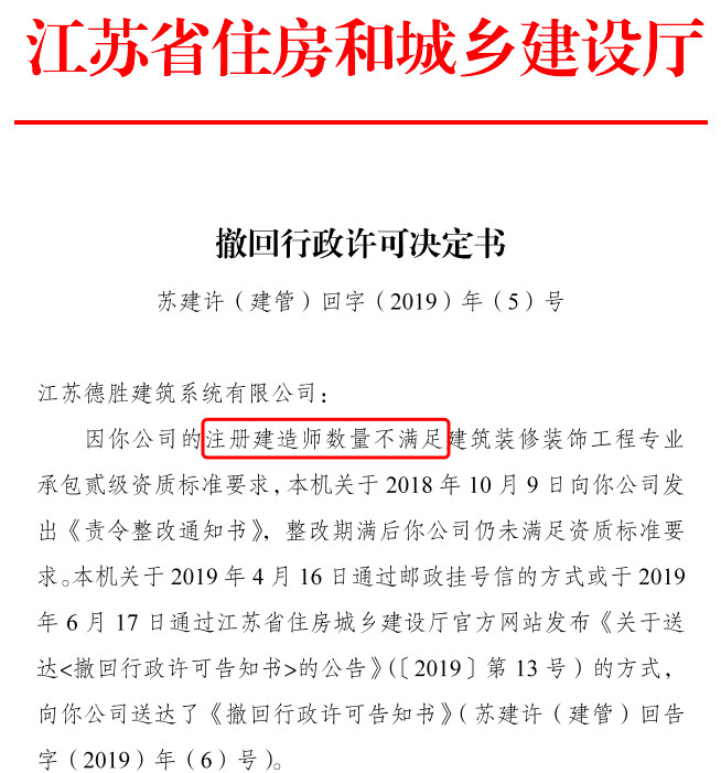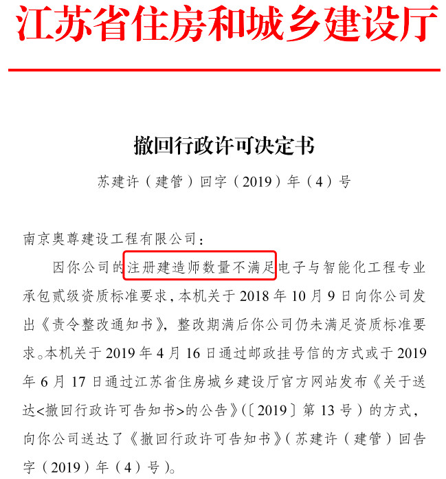 被撤回资质企业应于2020年1月20日前将相应资质证书正本及副本交回发证机关(地址:南京市建邺区汉中门大街145号省政务服务大厅)。