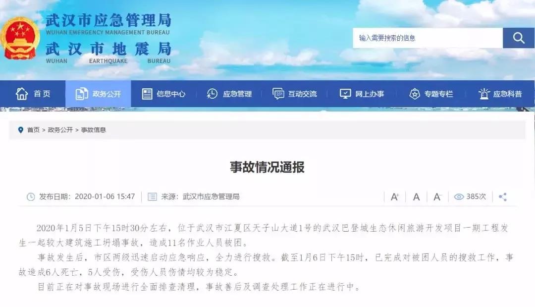 据武汉市应急管理局通报:2020年1月5日下午15时30分左右,位于武汉市江夏区天子山大道1号的武汉巴登城生态休闲旅游开发项目一期工程发生一起较大建筑施工坍塌事故,造成11名作业人员被困。