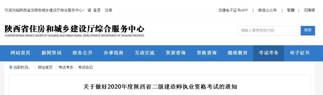 根据住房和城乡建设部执业资格注册中心《关于2020年度二级建造师执业资格考试(统考卷)有关工作的通知》(建注函〔2020〕4号)及省人力资源和社会保障厅、省住房和城乡建设厅《关于加强和完善二级建造师执业资格考试工作的通知》(陕人社函〔2015〕118号)要求,现就我省2020年度二级建造师执业资格考试工作有关事项通知如下: