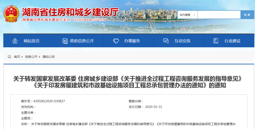 3月31日,湖南省住建厅转发国家发改委与住建部的两份文件,并根据自身实际提出:1、大力发展全过程工程咨询和工程总承包,使其成为主流的工程建设组织方式。