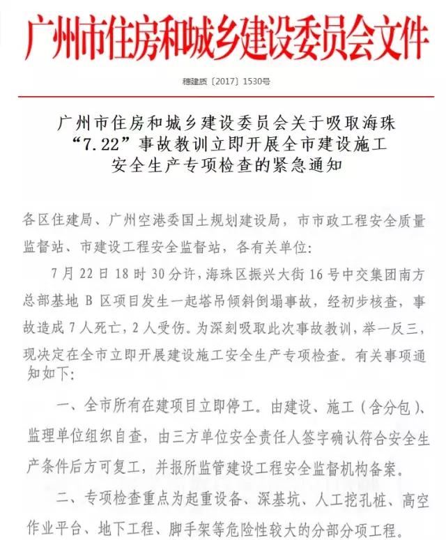 记者23日从广州市住建委官网获悉,《广州市住房和城乡建设委员会关于吸取海珠“7·22”事故教训立即开展全市建设施工安全生产专项检查的紧急通知》(以下简称“《紧急通知》”)公布。广州市住建委以海珠“7·22”事故为教训,决定在全市立即开展建设施工安全生产专项检查。其中,《紧急通知》提出,广州所有在建项目立即停工。